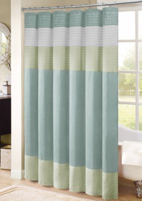This elegant shower curtain turns an ordinary bathroom into a really special place.Fabricated with Faux Silk, the surface comes alive with pieced fabrics of green and brown and ivory which are complemented with a pleated design running the width of the curtain.
