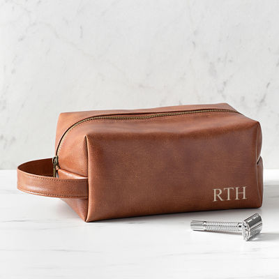 Description: Featuring a versatile interior and plenty of bonus items, personalized men's travel dopp kit is the perfect sized leather for carrying grooming tools and other accessories.